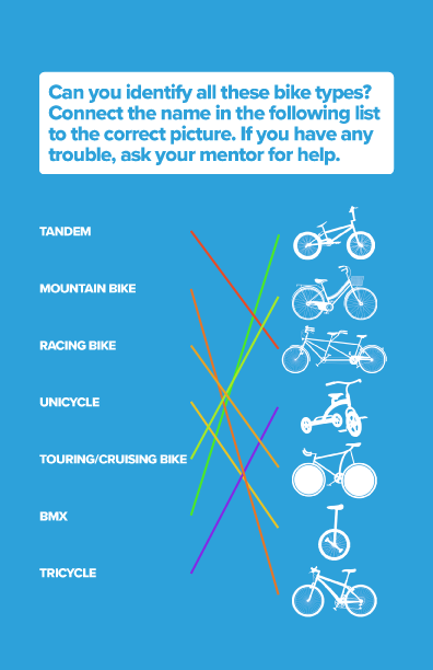 Included in the Bicycle Maintenance Adventure is an Activity Book for the boy / mentee. The following sections provide all the answers to the included activities.